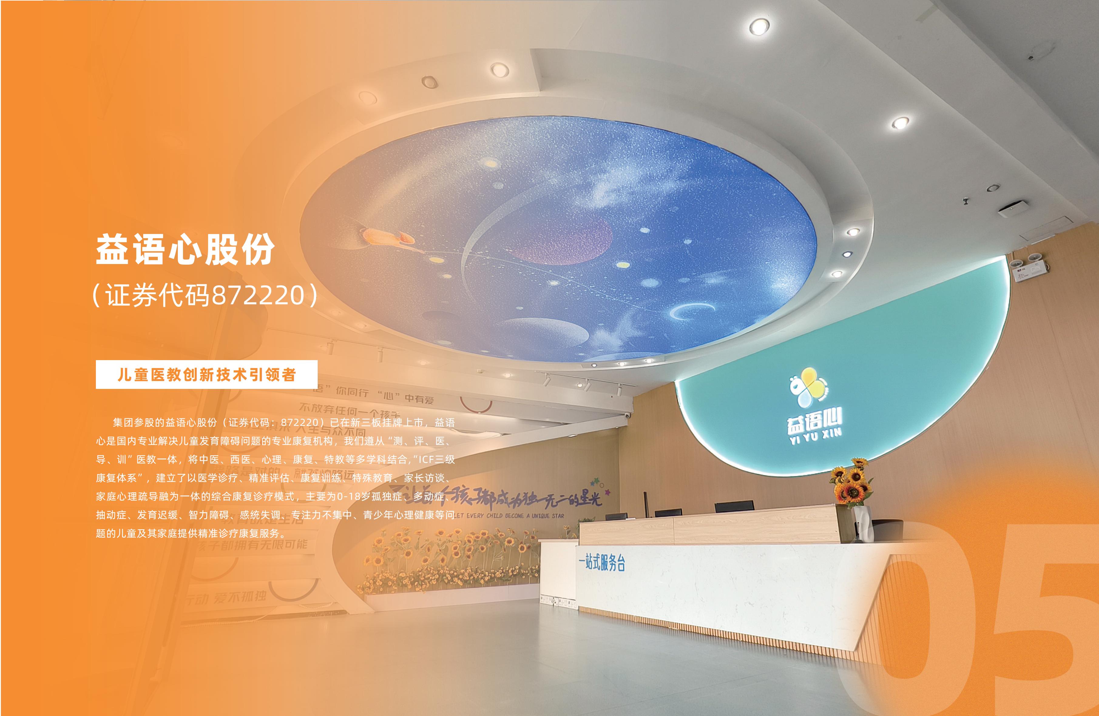 J9旗舰厅控股集團(tuán)有限公司(簡(jiǎn)稱(chēng)“J9旗舰厅控股集團(tuán)”)始建于2017年11月,集團(tuán)總部位于山東泰安,總建筑面積七萬(wàn)余平,現(xiàn)有員工700余人,是一家集醫(yī)、康、養(yǎng)、產(chǎn)、學(xué)、研于一體的綜合性健康產(chǎn)業(yè)集團(tuán)公司。集團(tuán)下設(shè)成康、醫(yī)康養(yǎng)、醫(yī)療科技、教育等事業(yè)部,通過(guò)“立足本土、放眼全球”的戰(zhàn)略布局,構(gòu)建起多維度的心理康復(fù)服務(wù)體系。 集團(tuán)參股的益語(yǔ)心股份(證券代碼:872220)已在新三板掛牌上市,益語(yǔ)心是國(guó)內(nèi)專(zhuān)業(yè)解決兒童發(fā)育障礙問(wèn)題的專(zhuān)業(yè)康復(fù)機(jī)構(gòu),我們遵從“測(cè)、評(píng)、醫(yī)、導(dǎo)、訓(xùn)”醫(yī)教一體,將中醫(yī)、西醫(yī)、心理、康復(fù)、特教等多學(xué)科結(jié)合,“ICF三級(jí)康復(fù)體系”,建立了以醫(yī)學(xué)診療、精準(zhǔn)評(píng)估、康復(fù)訓(xùn)練、特殊教育、家長(zhǎng)訪(fǎng)談、家庭心理疏導(dǎo)融為一體的綜合康復(fù)診療模式,主要為0-18歲孤獨(dú)癥、多動(dòng)癥、抽動(dòng)癥、發(fā)育遲緩、智力障礙、感統(tǒng)失調(diào)、專(zhuān)注力不集中、青少年心理健康等問(wèn)題的兒童及其家庭提供精準(zhǔn)診療康復(fù)服務(wù)。目前業(yè)務(wù)已經(jīng)拓展到浙江、江蘇、廣東等地。